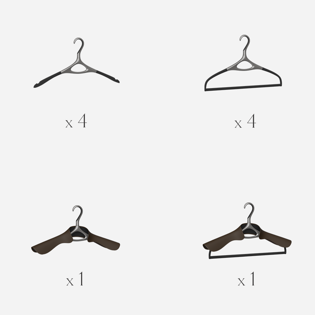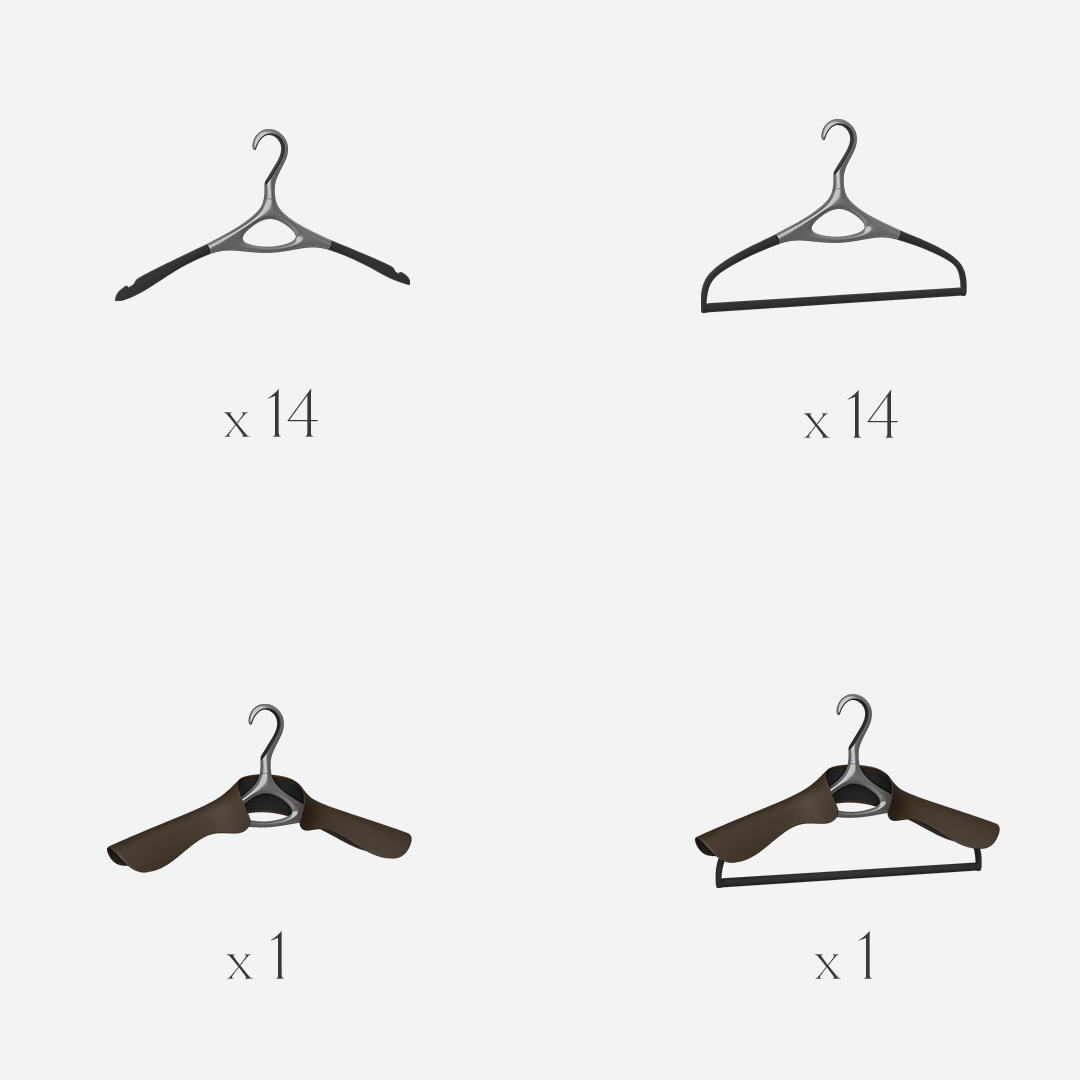 L'ensemble de 20 comprend : 9 cintres de base, 9 cintres pour pantalons, 1 cintre pour veste et 1 cintre pour veste & pantalon.