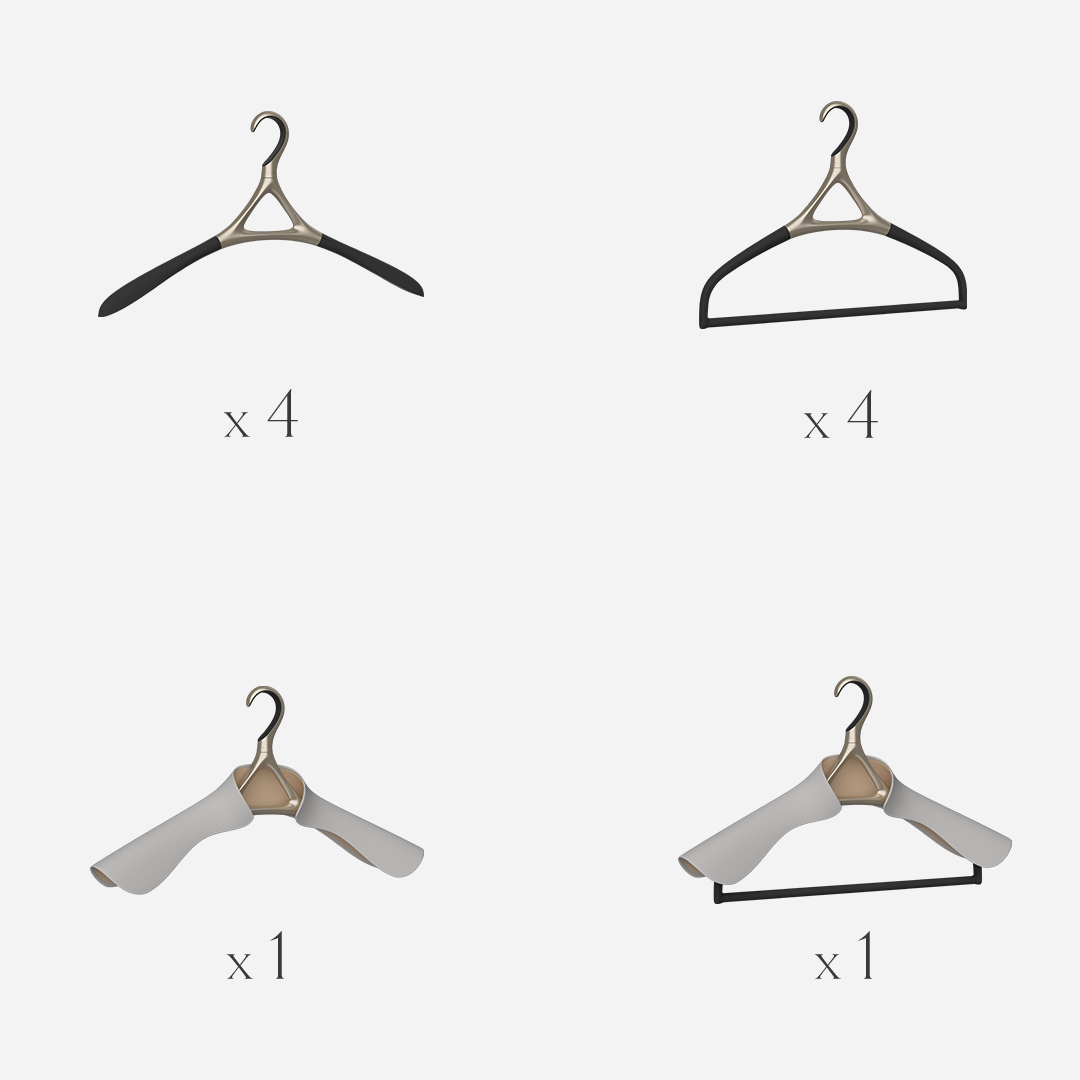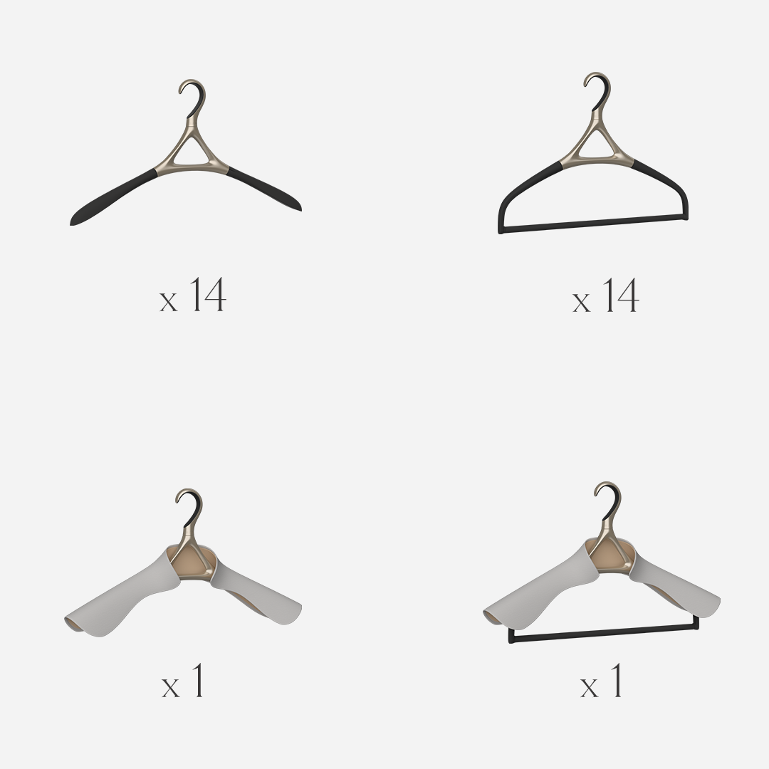 L'ensemble de 20 comprend : 9 cintres de base, 9 cintres pour pantalons, 1 cintre pour veste et 1 cintre pour veste & pantalon.