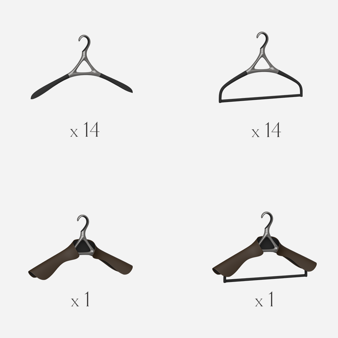 Progettati come un sistema raffinato per la conservazione dell'armadio, i nostri set Gun Metal, Nero e Moka della Serie H, disponibili in confezioni da 10, 20 e 30 appendini, portano un ritmo visivo e un ordine tranquillo nell'armadio di lusso. Come sistema coerente, questi pezzi artigianali proteggono i tuoi capi più preziosi, rispettandone l'architettura, la struttura e la silhouette.